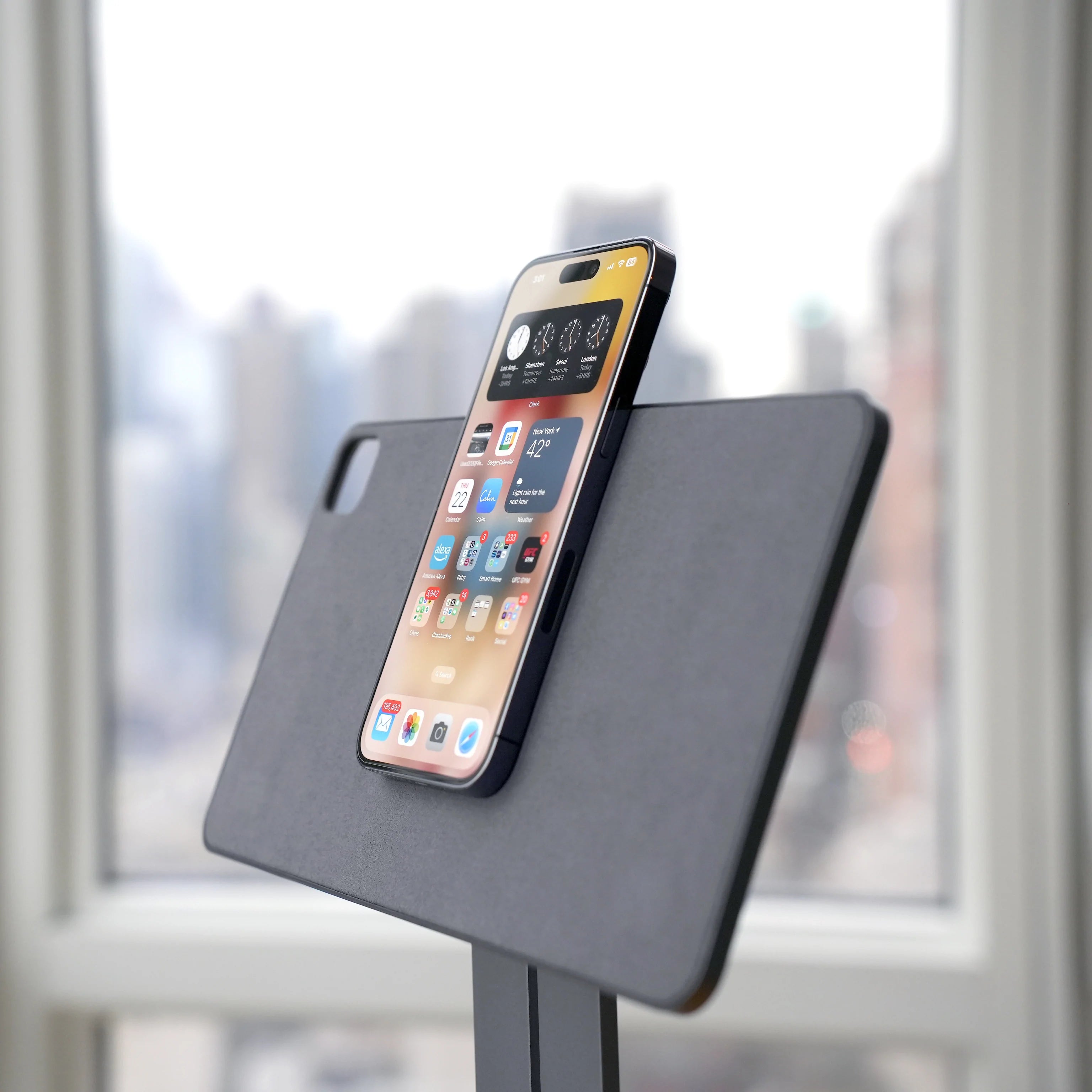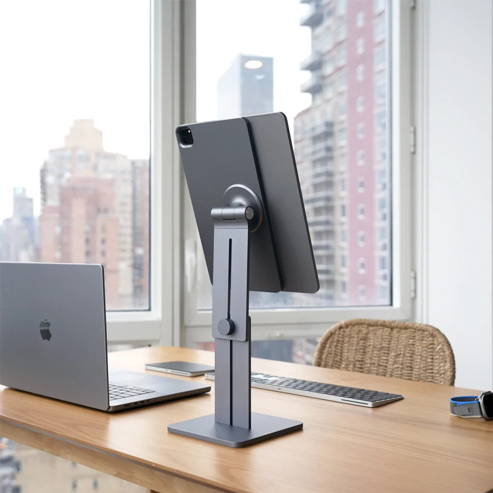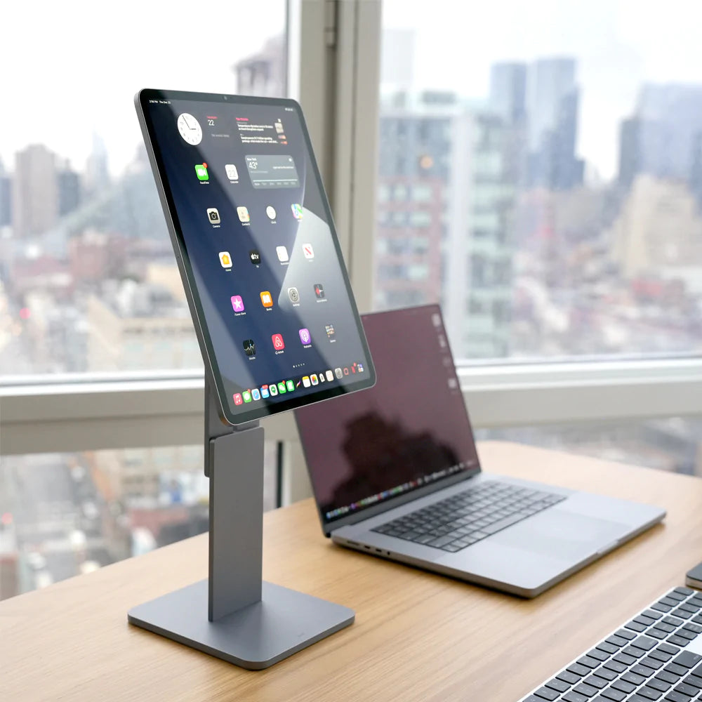 Featured in: MacWorld, 9to5Mac, Cult of Mac, iMore, iDownload. 12" (30cm) min. to 17.5" (45cm) max height. PATENTED. iPhone MagSafe. Includes Ücable. Model CJ091522: 12.9" and 11"/10.9". Model CJ010125: V2 13"/12.9" and 11"/10.9". Original and VESA Mount.